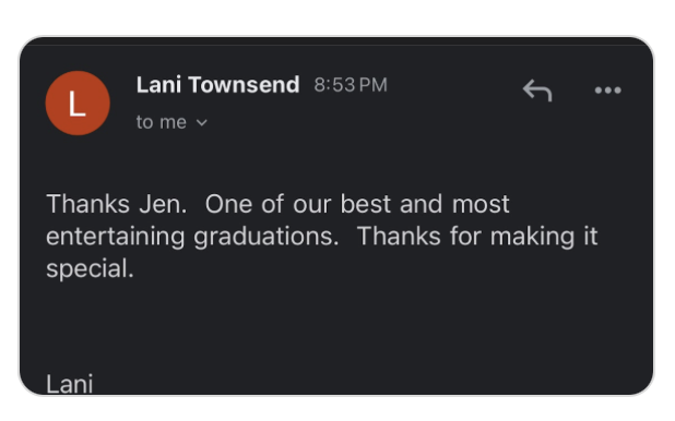 “I have over 90 guest presenters as part of Jim Place Services Graduate Classes. Jen is one of our very best presenters. Her message is very clear and meaningful. What makes her so special is her HUGE personality, warmth and humor.”