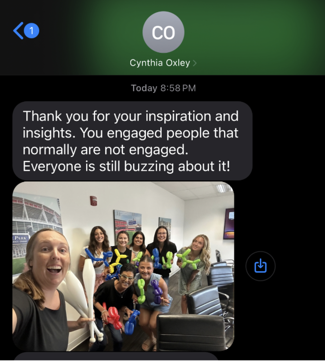 You’re incredibly amazing! I do not make that statement lightly. During our session in “Women in Leadership” with HCESC, as we learned to make balloon animals, mine kept popping each time I would twist and turn it. Although I do not recall the TEDTalk that you shared in that moment, but your voice, demeanor and willingness to encourage people to move beyond being afraid to fail was remarkable! I walked away feeling accomplished after I successfully designed an elephant and a butterfly with multiple attempts. The way you also inspired us educators to encourage each other in the process was a memorable experience, too. It was such a great day that in my new role in the Princeton City School District we have what’s called, “Viking University” where our faculty provides professional development for each other based upon the needs and interest of the community. I KNEW that we had to have you join us, and you did! I heard rave reviews afterwards!